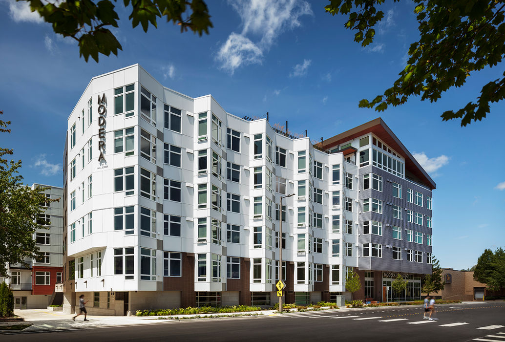 Modera Redmond is a graceful and efficiently designed 300 unit multifamily building that maximizes both efficiency and tenant livability. The building’s unusual lowercase “y” plan resolved many of the site’s challenges and lent itself to a high unit count and a rich collection of amenities for tenants. Its unique shape and ingenious massing attractively fit 300 light-filled residential units, two sun-drenched courtyards, a full complement of amenities, and bi-level parking onto a tiny 1.8 acre footprint. With strategically placed courtyards and close attention to square footage and standardization, the building deftly balances circulation spaces, common areas, and rentable square footage with tenant delight and cost-effective construction. The front façade features five angular wave-like bay windows that balance the building’s size while offsetting its airy, light-filled lobby.
