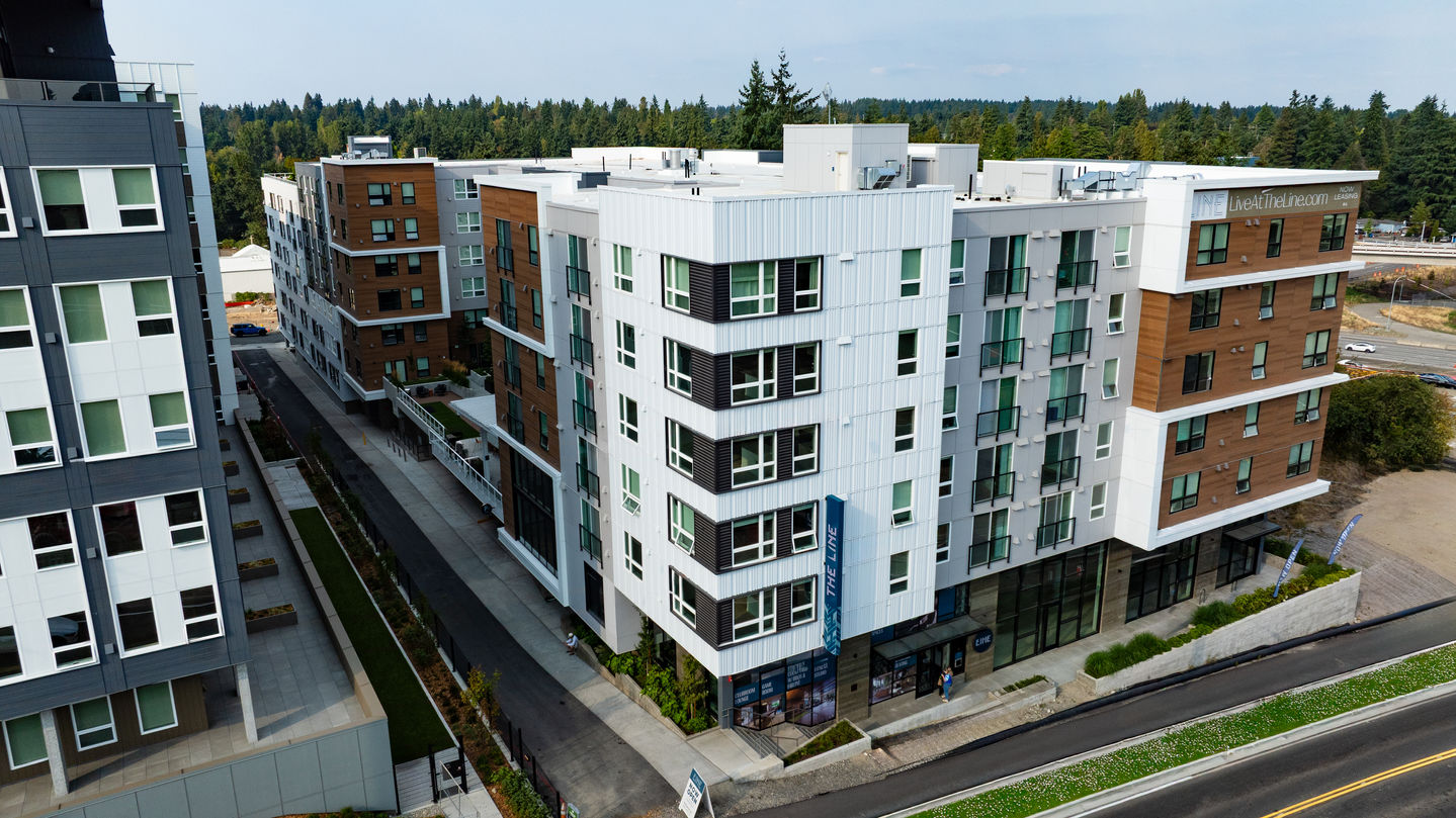 As architects of the first mixed-use apartment project to be built within Shoreline’s newly upzoned Link Light Rail district, we knew The LINE would set the tone for future development. We began by researching the materials and street presence of upcoming nearby projects, to ensure coherence within the emerging neighborhood. As Transit Oriented Development (TOD), The LINE required small blocks and plenty of pedestrian access. So we designed a woonerf to run through the project, to provide greater neighborhood access. For further pedestrian scale we set the building back on the street fronts, articulated the base of the building, and created a residential courtyard off the woonerf. Road upgrades happening concurrently with construction strained much of this work—particularly grading, height calculations, and access—but our deep TOD experience helped us meet the challenges. Design wise, to reinforce the “line” theme we crafted LED-lit linear motifs to thread up the building at the corners against a warm wood-like background, with bays and facades between for contrast. The result is a striking gateway building visible from a distance, with amenities including a lounge and meeting rooms; game, podcast, and media rooms; a fitness room; two levels of underground parking; and LEED-Platinum certification.
